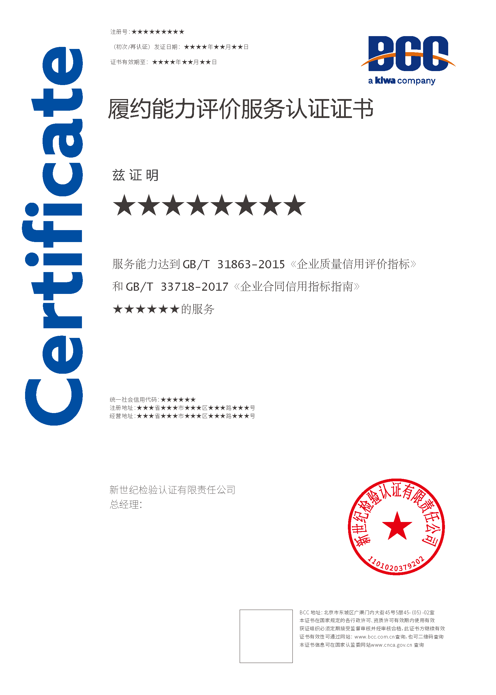 本頁涉及的認證服務中均有對應的《認證實施規(guī)則》,BCC擁有其最終解釋權。任何組織及個人未經BCC許可,不得以任何形式全部或部分使用(法律要求除外)認證相關信息。如需獲取相關實施規(guī)則請用以下方式聯(lián)系獲?。弘娫挘?10-58579316   郵箱:fwjs@kiwa.cn