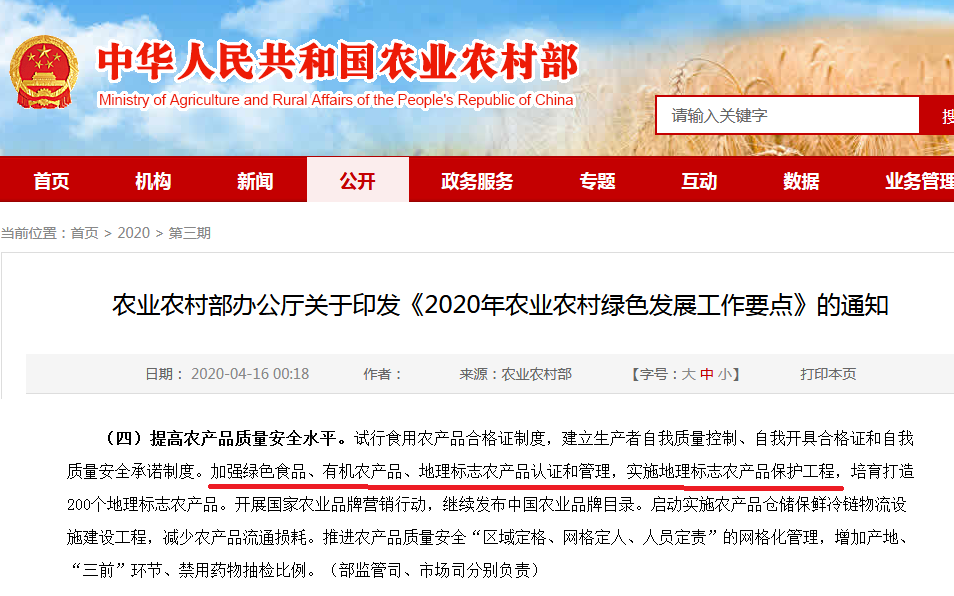通知對于“加強(qiáng)綠色食品、有機(jī)農(nóng)產(chǎn)品、地理標(biāo)志農(nóng)產(chǎn)品認(rèn)證和管理,實(shí)施地理標(biāo)志農(nóng)產(chǎn)品保護(hù)工程,培育打造200個(gè)地理標(biāo)志農(nóng)產(chǎn)品。”的描述,要全面提高農(nóng)產(chǎn)品質(zhì)量安全水平。
